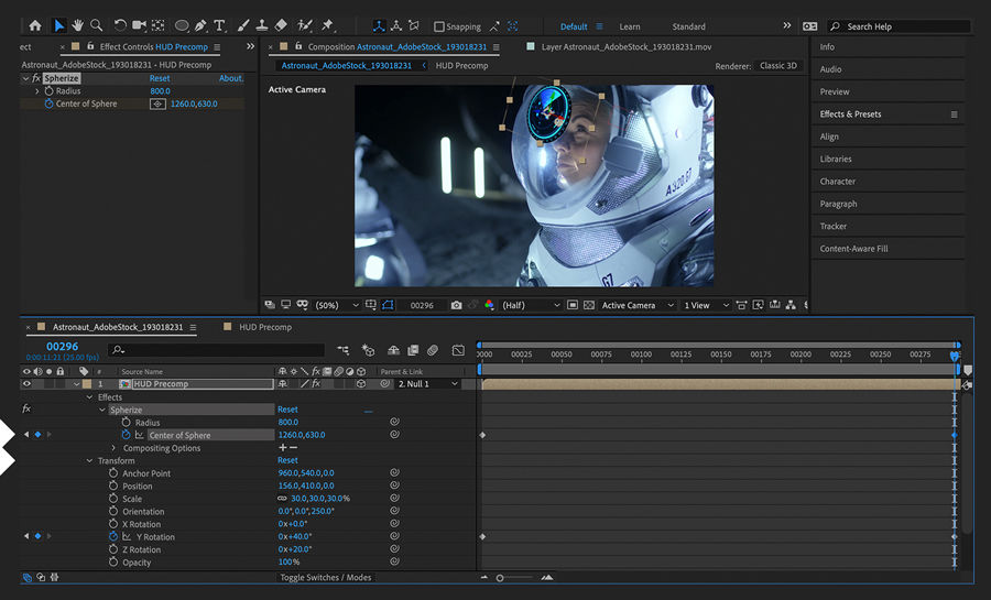 Back in the main comp, add the Spherize effect to the precomp layer and increase Radius to add some curvature to it. Depending on where your HUD belongs in the scene, adjust Center of Sphere’s X and Y values too. Play the comp to see how the HUD appears affixed to its intended surface as the camera moves in on the subject.