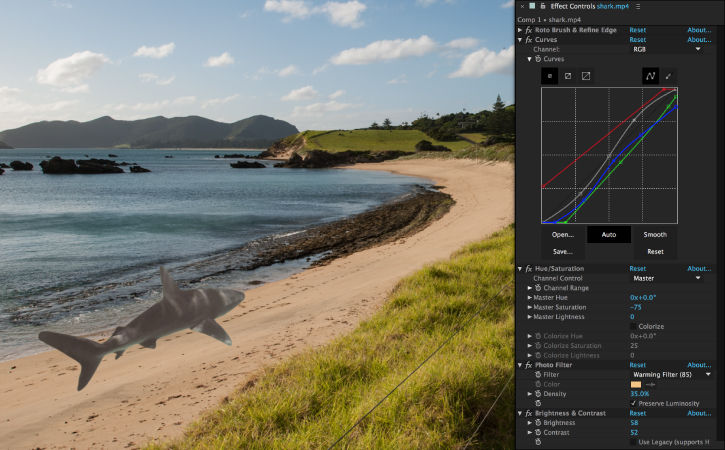 To make a convincing composite, the shark will need some color correction to help match the background. Select the shark.mp4 layer in the Timeline and choose Effect > Color Correction. For this footage, a number of different effect layers are needed to correct the footage.