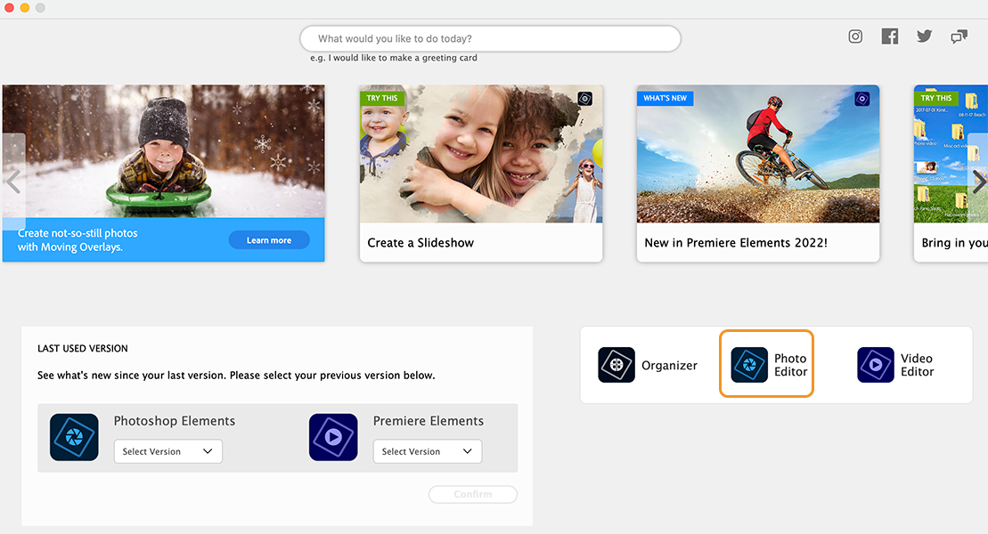Atlasiet fotoattēlu redaktoru, lai palaistu lietotni Adobe Photoshop Elements 2022. Atlasiet fotoattēlu redaktoru, lai palaistu lietotni Adobe Photoshop Elements 2022. -