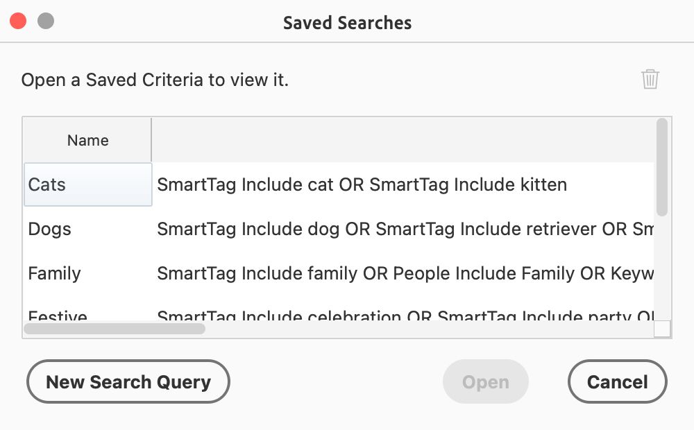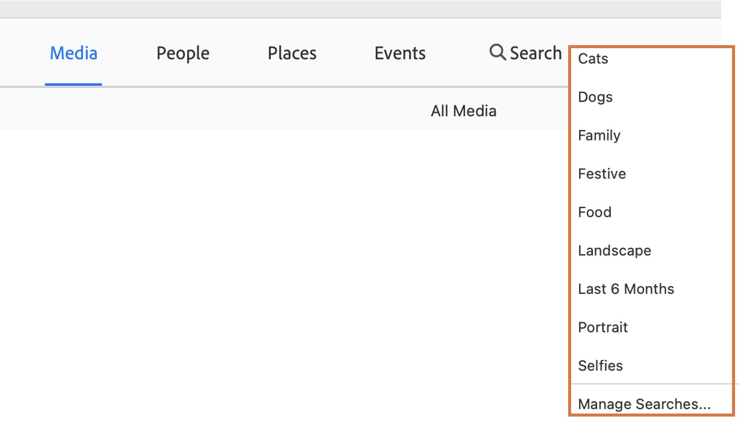 Click to open the drop-down and select from the eight predefined saved searches: Cats, Dogs, Family, Festive, Food, Landscape, Portrait, Selfies.