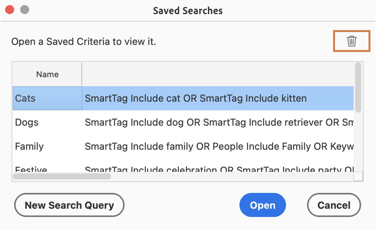 In the Saved Searches dialog box, select the Saved Search you want to delete. Click the trash icon. Click OK.