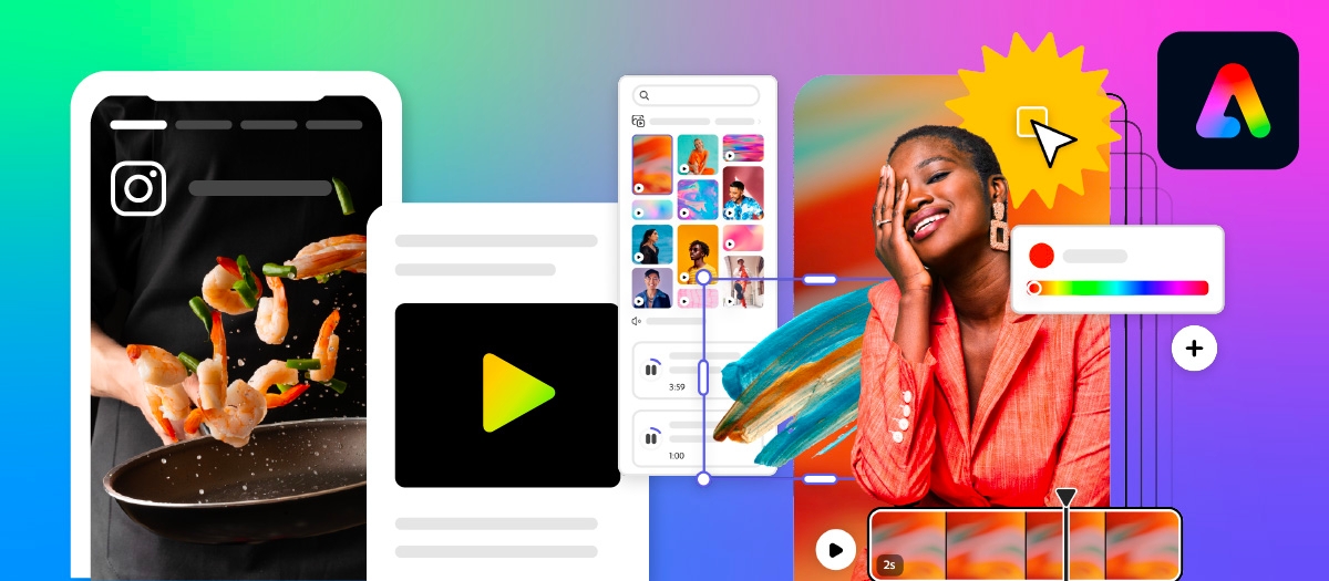 Izbaudiet Adobe Express bezmaksas versiju, lai izveidotu skrejlapas, brošūras, sociālo tīklu ierakstus un PDF failus. Ģenerējiet attēlus no teksta, veiciet rediģēšanu ar vienu klikšķi un veidojiet profesionālus videoklipus, izmantojot vilkšanas un nomešanas rīkus.