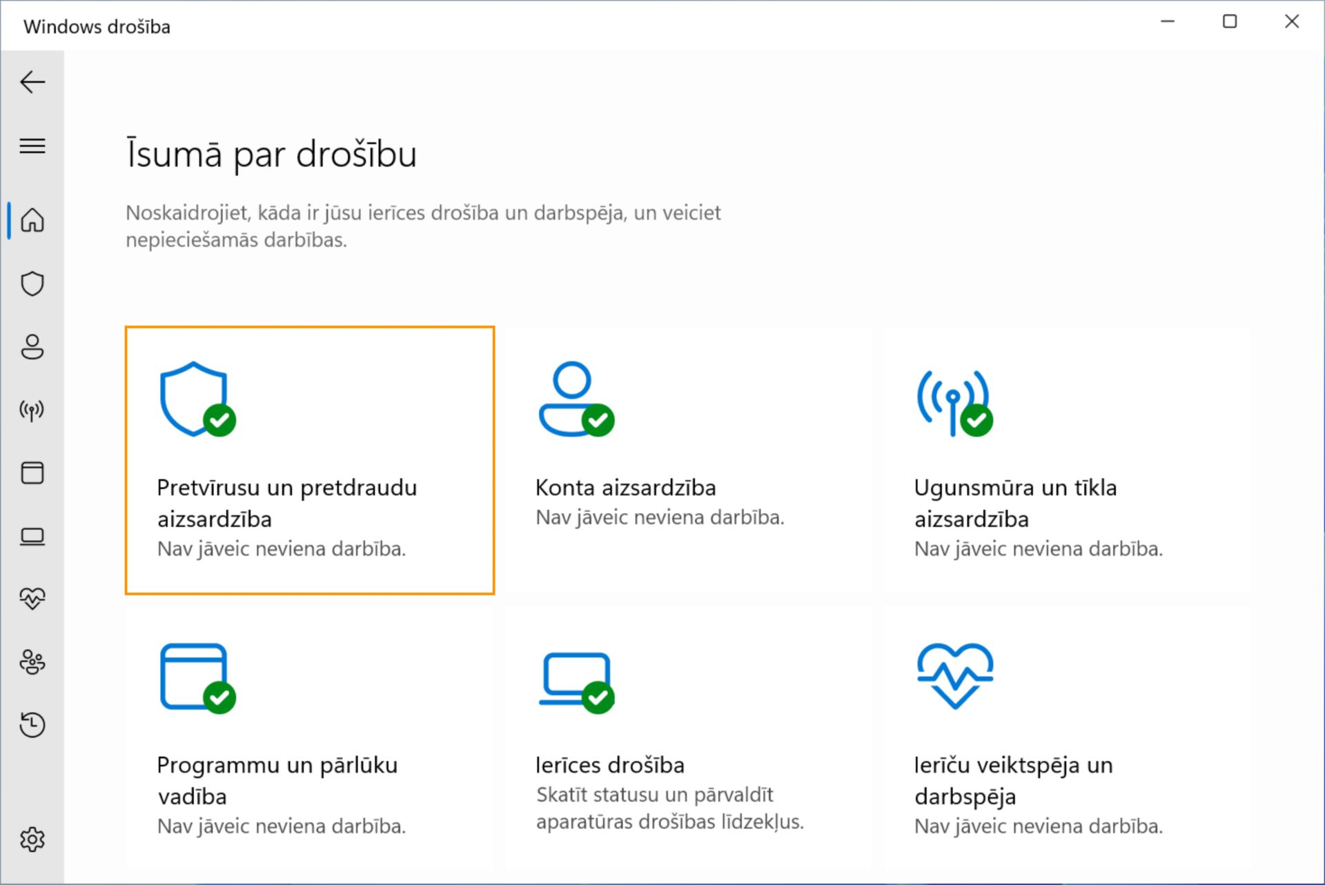 Pārliecinieties, ka ir atinstalētas visas pārējās antivīrusu programmas un ir ieslēgta Windows Defender reālā laika aizsardzība.