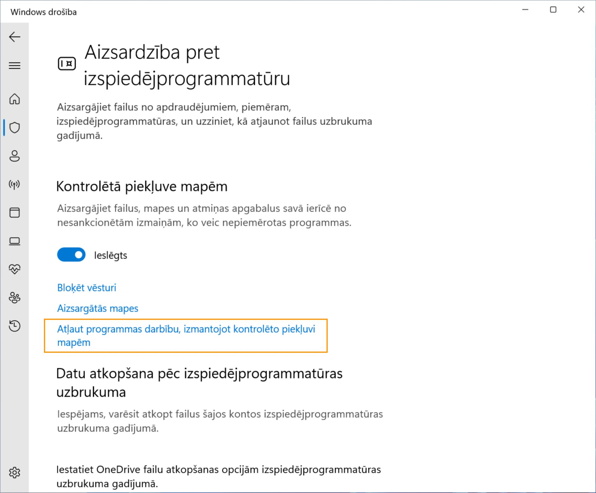 Izvēlieties iespēju Atļaut programmas darbību, izmantojot kontrolēto piekļuvi mapēm.