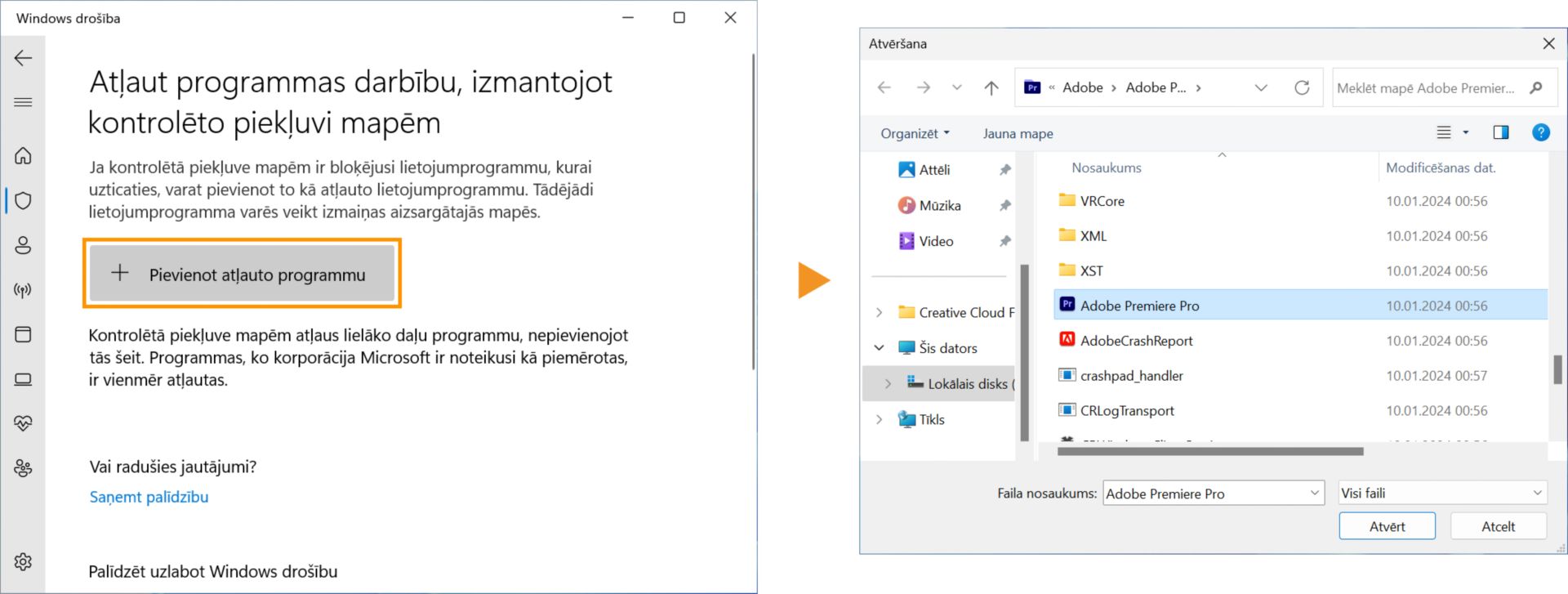 Lai palaistu Premiere Pro, Adobe Media Encoder vai After Effects, kad ir iespējota Kontrolēta piekļuve mapēm, rīkojieties šādi: