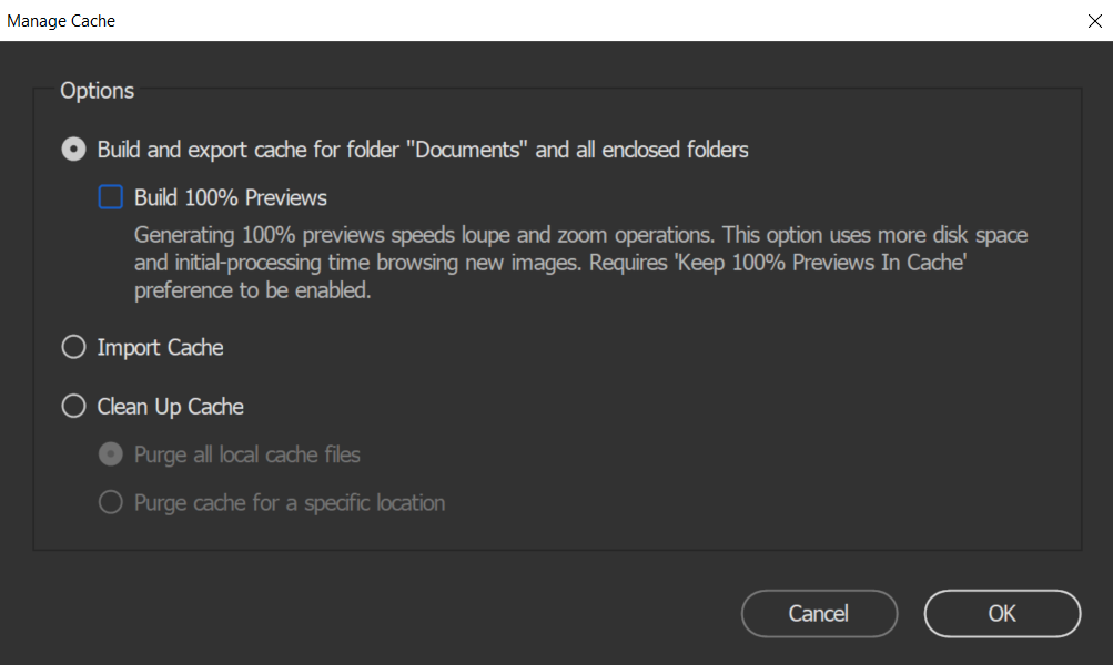 ولذا، يُوصى بعدم استخدام ميزة ذاكرة التخزين المؤقت المشتركة إذا كنتَ مستخدِمًا وحيدًا. في هذه الحالة، تتّبع عملية إنشاء ذاكرة التخزين المؤقت وإدارتها النهج نفسه المعتاد في Bridge CC 2018.