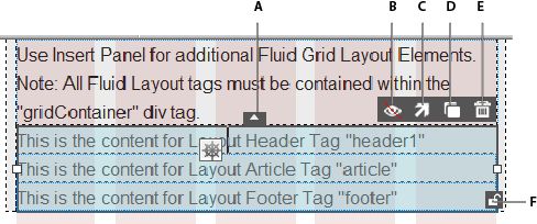 عند تحديد عنصر مدرج، يتم عرض خيارات إخفاء Div أو تكراره أو قفله أو حذفه. بالنسبة إلى عناصر Div الموضوعة في طبقات فوق بعضها البعض، يتم عرض خيار تبديل Divs.