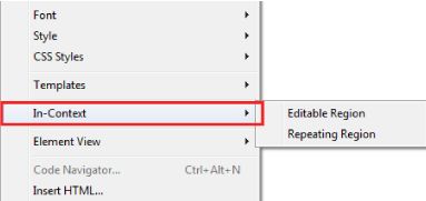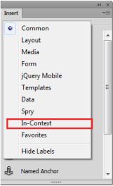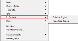 الخيار InContext editing في القائمة Insert، واللوحة Insert، والنقر بزر الماوس الأيمن فوق قائمة السياق (قبل Dreamweaver CC)