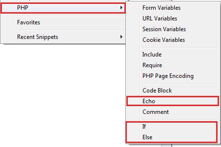 تم حذف الخيارات If، وElse، وEcho في القائمة Insert ولوحة Insert الخاصة بملف PHP