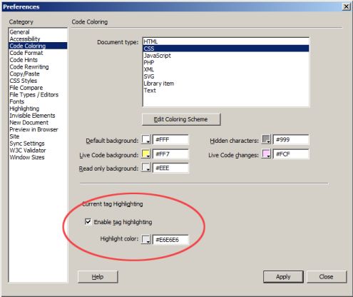 يمكنك تغيير لون تمييز العلامة في Preferences (تلوين التعليمة البرمجية).