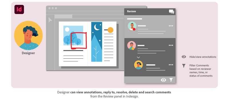 كمصمم، يمكنك عرض الملاحظات الواردة من المساهمين وإدارتها داخل InDesign. ترتبط التعليقات التي تتلقاها بالكائنات والصفحات ذات الصلة في InDesign.