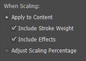 يمكنك تحديد كيفية تتبع القياس في الواجهة. إذا كان خيار التفضيل Apply To Content محددًاً في التفضيلات العامة، فإن قيم القياس يتم إعادة ضبطها على 100% في لوحة Transform بعد قياس الكائن. إذا كان خيار Adjust Scaling Percentage محددًا، فإن قيم القياس تظل كما هي محددة (مثل 125%).