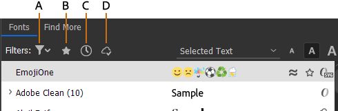 يمكنك البحث سريعًا عن الخطوط التي تستخدمها في كثير من الأحيان بتمييز مجموعات الخطوط الفردية بنجمة على أنها مفضلة أو بالتحديد من الخطوط المستخدمة مؤخرًا التي تظهر أعلى قائمة الخطوط. يتم الاحتفاظ بالخطوط المستخدمة مؤخرًا والخطوط المميزة بنجمة على مستوى جلسات عمل InDesign.