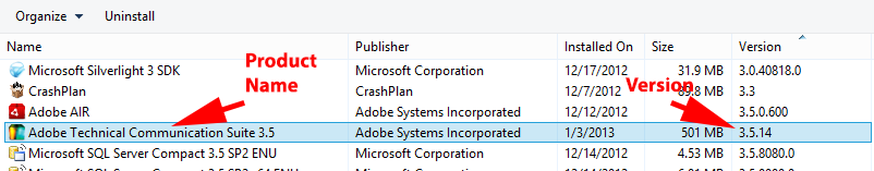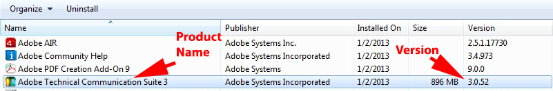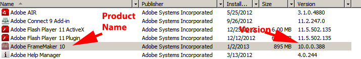 • Depending on which product you have installed, you see either FrameMaker or Technical Communication Suite in the Name Column (See the screenshots below.)