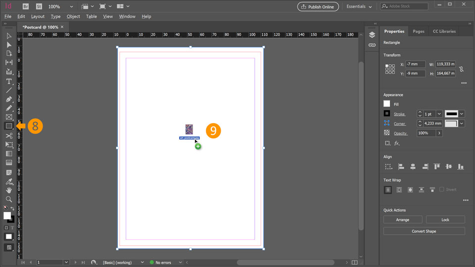 9. From the practice files drag the "art_postcard.jpg" image onto the white rectangle you have just created.