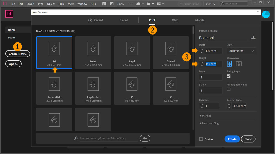 3. With the A4 document preset selected, edit the PRESET DETAILS: Set name, Width to 105 mm, Height to 148 mm.