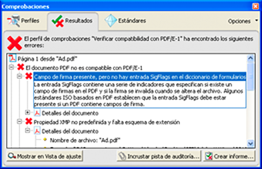 Al incrustar una pista de auditoría, se añaden una firma digital y la información de la pista de auditoría. La información de la pista de auditoría incluye el perfil utilizado y la aplicación que lo creó. También especifica si la inspección de comprobaciones se realizó correctamente.