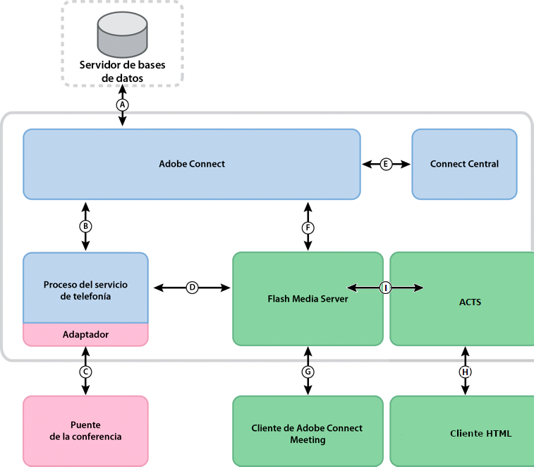 A. Persistencia. B. Gestión de servicios y conmutación por error, conexión al servicio e intermediación de sesión, suministro de datos de usuario y acceso. C. Comandos nativos y eventos que utilizan API del distribuidor de propiedad para el control de conferencias. D. Comandos y eventos que utilizan llamadas RPC. E. Suministro. F. Solicitud de servicio de telefonía. G. Comandos y estado de telefonía. H. Cliente HTML I. ACTS