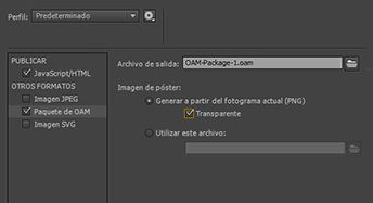 Ahora se puede exportar el contenido de Animate en ActionScript, WebGL o HTML5 Canvas a los archivos de widget animados de OAM (.oam). Los archivos de OAM generados con Animate se pueden colocar en Dreamweaver, Muse e InDesign. Para exportar el contenido de Animate al formato OAM, haga lo siguiente: