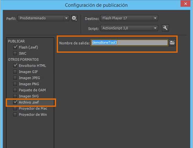 Seleccione un documento de ActionScript > Archivo > Configuración de publicación > Otros formatos > Archivo SWF.