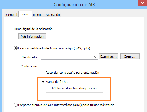 1. En la ficha Firma, seleccione Preparar un archivo de AIR Intermediate (AIRI) que se firmará más tarde y haga clic en Aceptar.