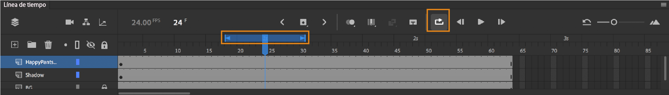 - Con la opción “bucle” activada en la cronología, también se pueden reproducir en bucle flujos de audio dentro de un intervalo de fotogramas junto con otras animaciones.