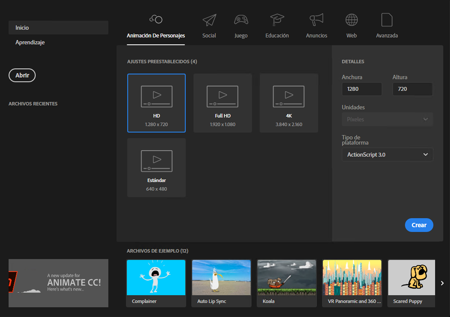 - Creación y publicación de documentos de HTML5 Canvas en Animate