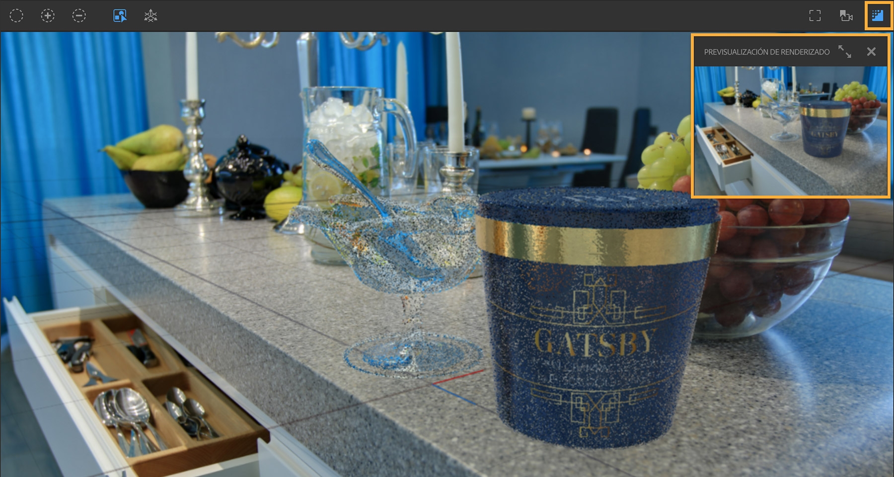 Haz clic en Previsualización de renderizado para previsualizar rápidamente el efecto de la luz y las sombras antes de renderizar tu imagen al completo en el próximo paso. Cierra la ventana Previsualización de renderizado cuando acabes.