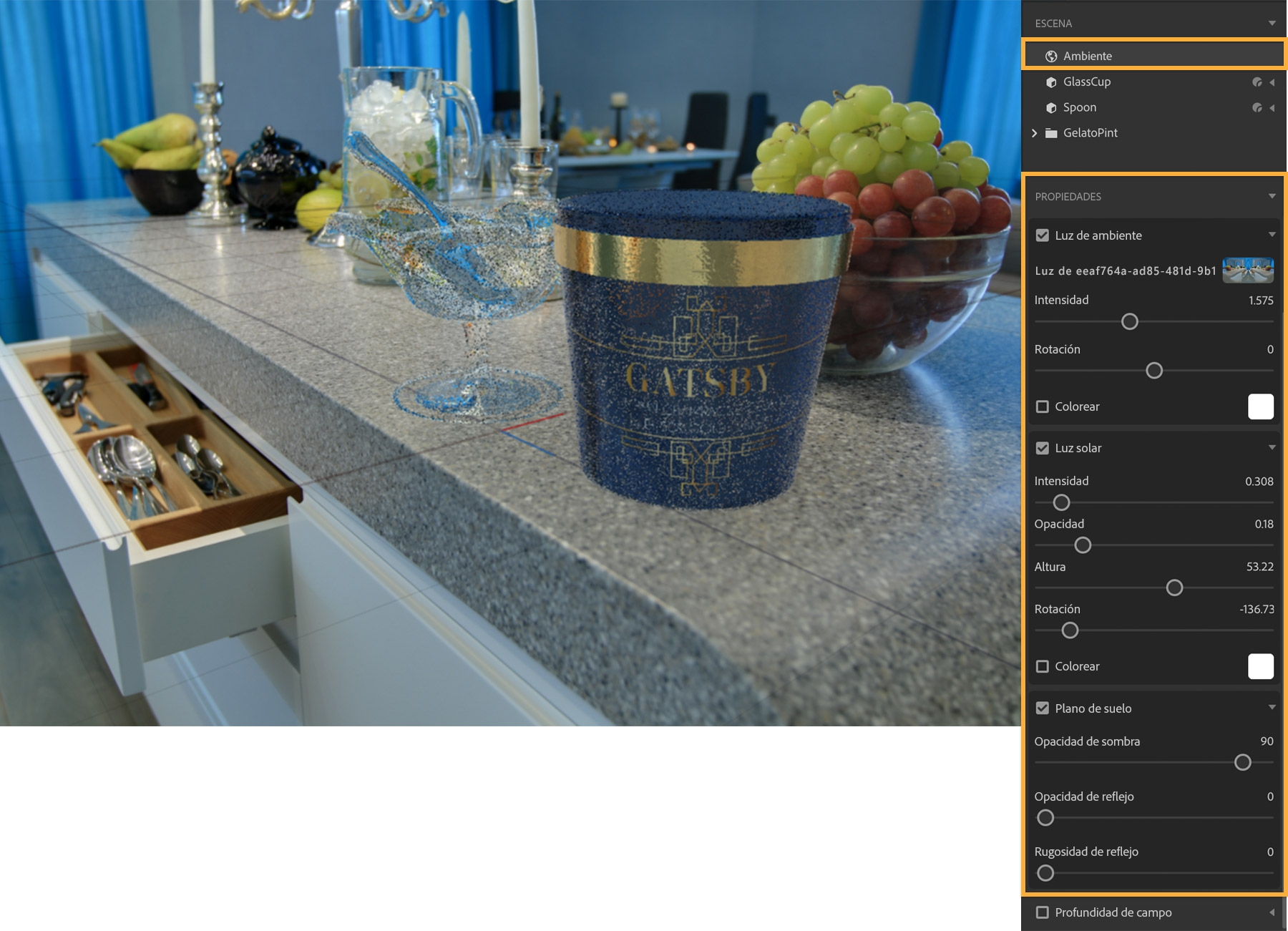 Haz clic en Ambiente en el panel Escena. Esta escena ya está iluminada con luz basada en imágenes panorámicas, una función que toma la imagen de fondo como origen. Puedes modificar algunas de sus propiedades ajustando los parámetros Intensidad y Rotación. Selecciona también Luz solar para ajustar la intensidad y la dirección de la luz que influyen sobre las sombras y edita las propiedades de la opción Plano de suelo para perfeccionar las sombras.