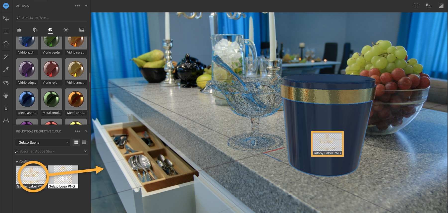 Abre la biblioteca Gelato Scene en el panel Bibliotecas Creative Cloud. Arrastra la ilustración “Gatsby Label” y sitúala sobre la parte inferior del bote de helado hasta que se muestre resaltado. A continuación, suelta la ilustración de la etiqueta en esa posición para colocarla.