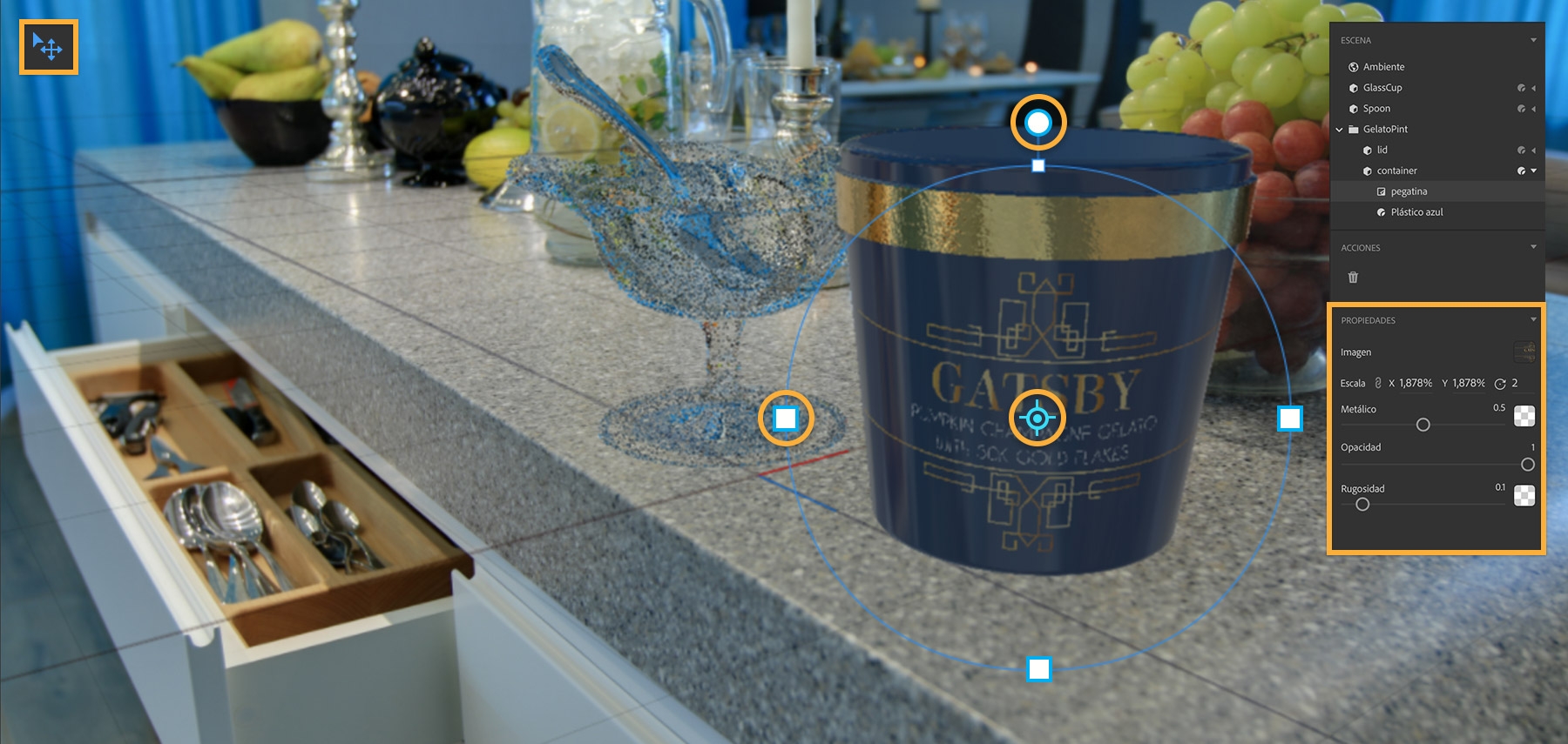 Para perfeccionar el aspecto del bote, despliega el menú GelatoPint en el panel Escena. Selecciona Plástico azul. Puedes cambiar los atributos del material, entre ellos, Color base, Resplandor y Rugosidad en el panel Propiedades situado bajo el panel Escena.