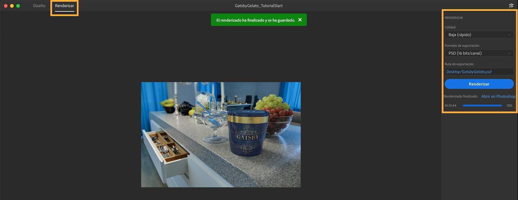 Haz clic en la pestaña Renderizar, en la parte superior. Concreta el parámetro de calidad, selecciona un formato de exportación y añade una ruta para el archivo. Haz clic en Renderizar. Hemos seleccionado la opción de calidad Baja (rápido) y el formato PSD. Cuando se complete el renderizado, haz clic en Abrir en Photoshop.