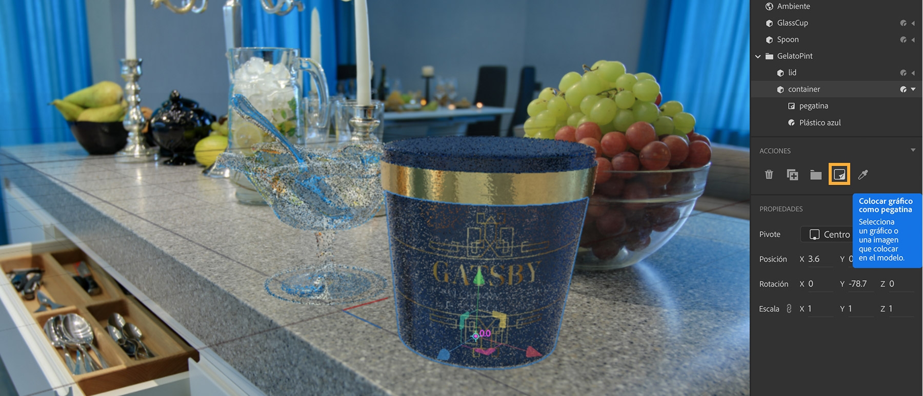Añade un modelo 3D de un bote de helado. Selecciona Archivo > Importar > Modelo 3D y busca “GelatoPint”.