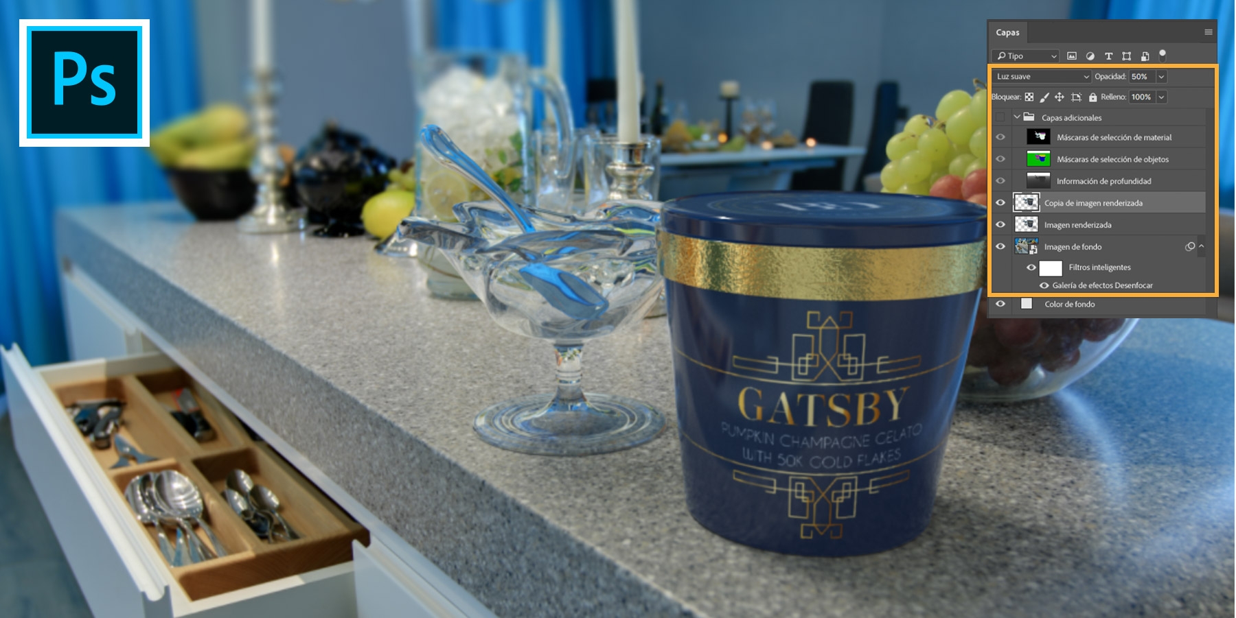 Para aplicar un efecto de profundidad, hemos convertido la capa Fondo en un objeto inteligente (se consigue haciendo clic con el botón derecho del ratón sobre la imagen y seleccionando Convertir en objeto inteligente). Con la capa seleccionada, añadimos un efecto de desenfoque (selecciona Filtro > Galería de efectos Desenfocar > Cambio de inclinación). Además, hemos duplicado la capa Imagen renderizada y hemos aplicado el modo de fusión Luz suave con una opacidad del 50 %para hacer que el bote de helado destaque.
