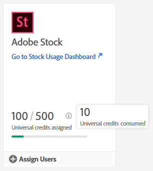 Los administradores pueden supervisar el consumo de créditos directamente desde Admin Console. También disponen de acceso a una interfaz de supervisión dedicada en el sitio web de Adobe Stock. Pueden acceder a la interfaz de supervisión a través del vínculo Ir al panel Uso de Stock de la tarjeta de Adobe Stock en la pestaña Productos de la Admin Console o a través de la sección Historial de licencias del sitio web de Adobe Stock.