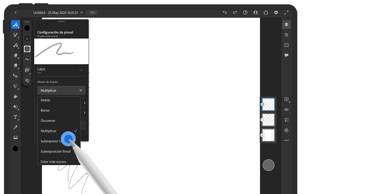 Toque el icono Configuración de pincel para cambiar diferentes ajustes, como el espaciado, el ángulo, el modo de fusión, la presión del puntero, etc.