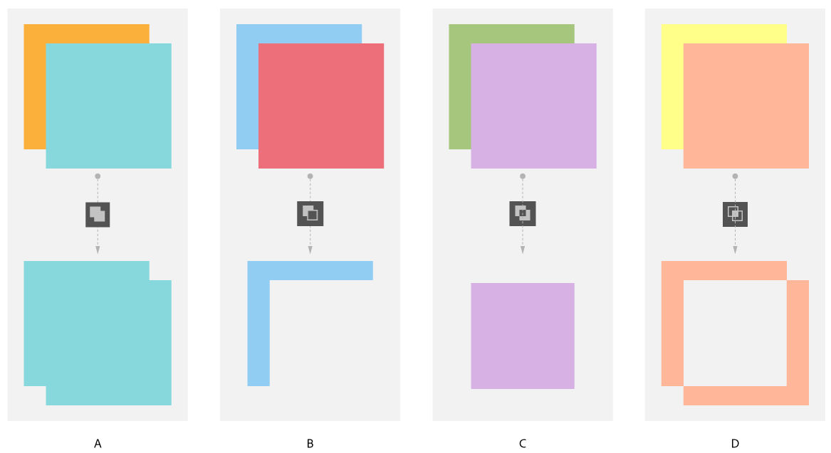 A. Añadir a área de forma con el modo Unificar B. Restar de área de forma con el modo Menos frente C. Intersecar con el área de forma con el modo Formar intersección D. Excluir áreas de formas superpuestas con el modo Excluir