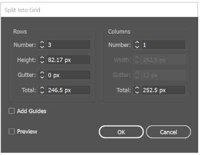 El comando Filas y columnas permite dividir uno o varios objetos en varios objetos rectangulares dispuestos en filas y columnas. Puede ajustar con precisión la altura, anchura y medianil entre filas y columnas, así como crear guías para disponer la ilustración de forma rápida.