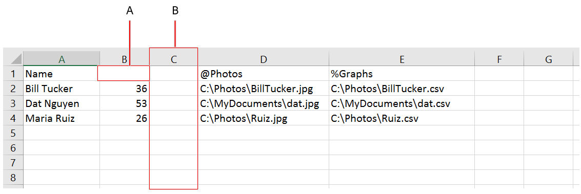 - El archivo de origen de datos no tiene ninguna columna en blanco entre las columnas rellenas. Por ejemplo, Illustrator muestra el mensaje de error cuando las columnas B y D del archivo de origen de datos contienen datos pero la columna C está vacía.