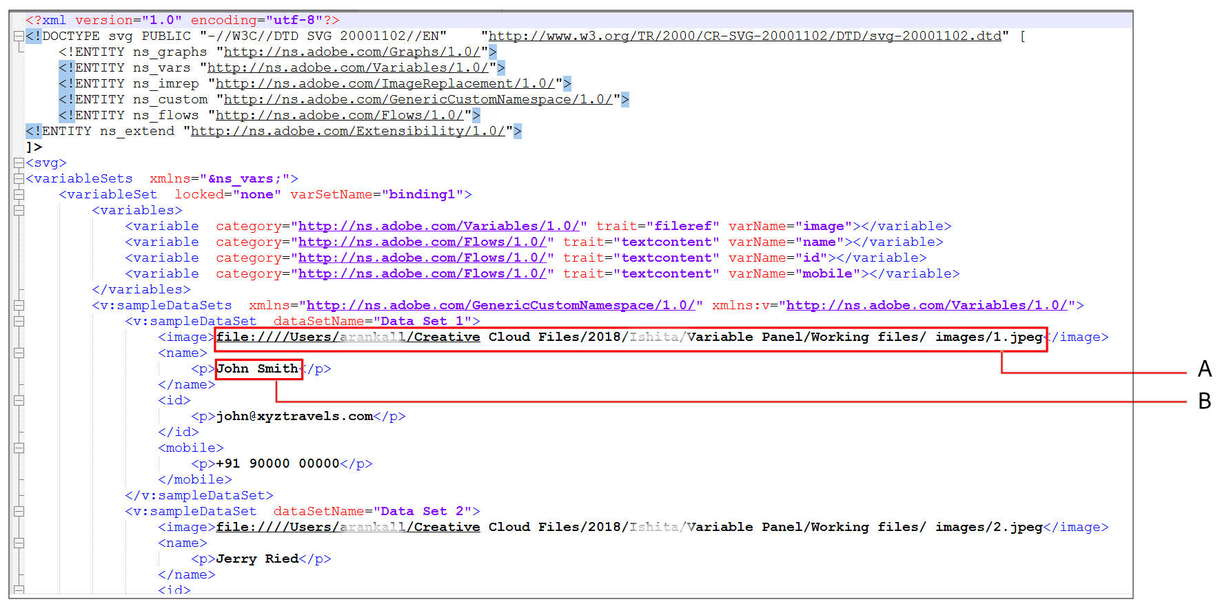 El panel Variables muestra los nombres de objetos dinámicos tal como aparecen en el panel Capas. Si guarda la plantilla en formato SVG para utilizarla con otros productos de Adobe, estos nombres de objeto deben cumplir las convenciones XML de asignación de nombres. Por ejemplo, los nombres XML deben empezar por una letra, un guion bajo o dos puntos y no pueden contener espacios.