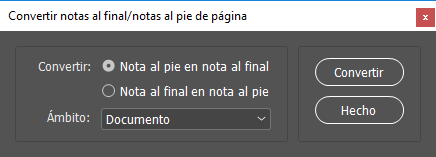 Para convertir las notas a pie de página en notas de final de sección y viceversa en el documento: