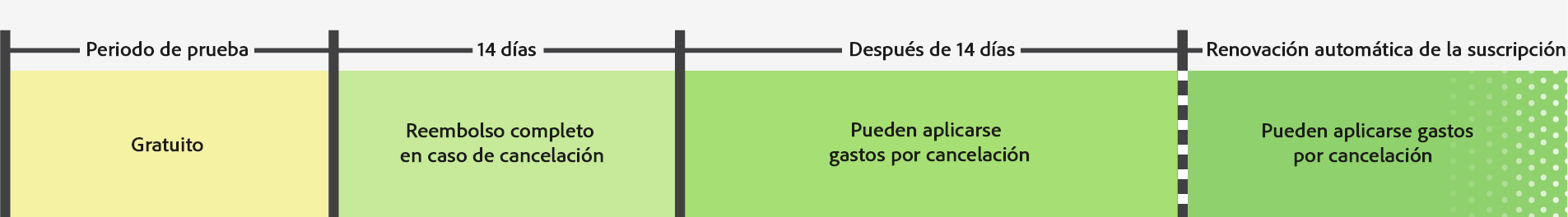 Si compra directamente a Adobe y cancela pasados 14 días desde la compra inicial, el pago no es reembolsable y puede estar sujeto a un cargo por cancelación.