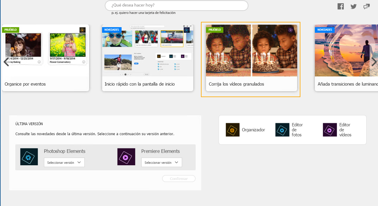 Al iniciar Premiere Elements, podrá encontrar las nuevas tarjetas "Pruébelo" con etiquetas verdes en la pantalla de inicio. Estas tarjetas le permiten averiguar y obtener más información sobre las nuevas funciones de la aplicación, como reducir el ruido o usar el efecto time-lapse, el relleno de fotogramas y mucho más.