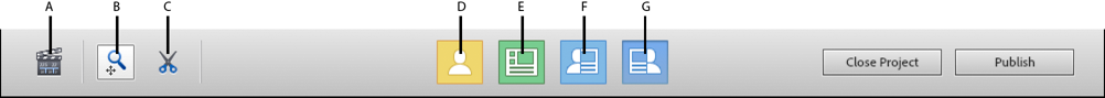 A. Botón Marca B. Botón Panorámica y zoom C. Botón Cortar D. Diseño Solo presentador E. Diseño Solo presentación F. Diseño Ambos (presentador a la izquierda) G. Diseño Ambos (presentador a la derecha)