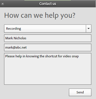 Si se producen errores al utilizar Adobe Presenter Video Express y necesita ponerse en contacto con el equipo de asistencia desde la propia aplicación, utilice el vínculo Contactar con nosotros.