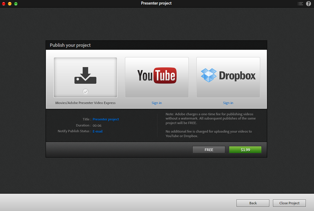 En la pantalla Publicar, seleccione descargar al escritorio, cargar a YouTube, a Dropbox (o una combinación de las tres opciones). Para cargar vídeos en YouTube o Dropbox, haga clic en Iniciar sesión en la sección correspondiente.