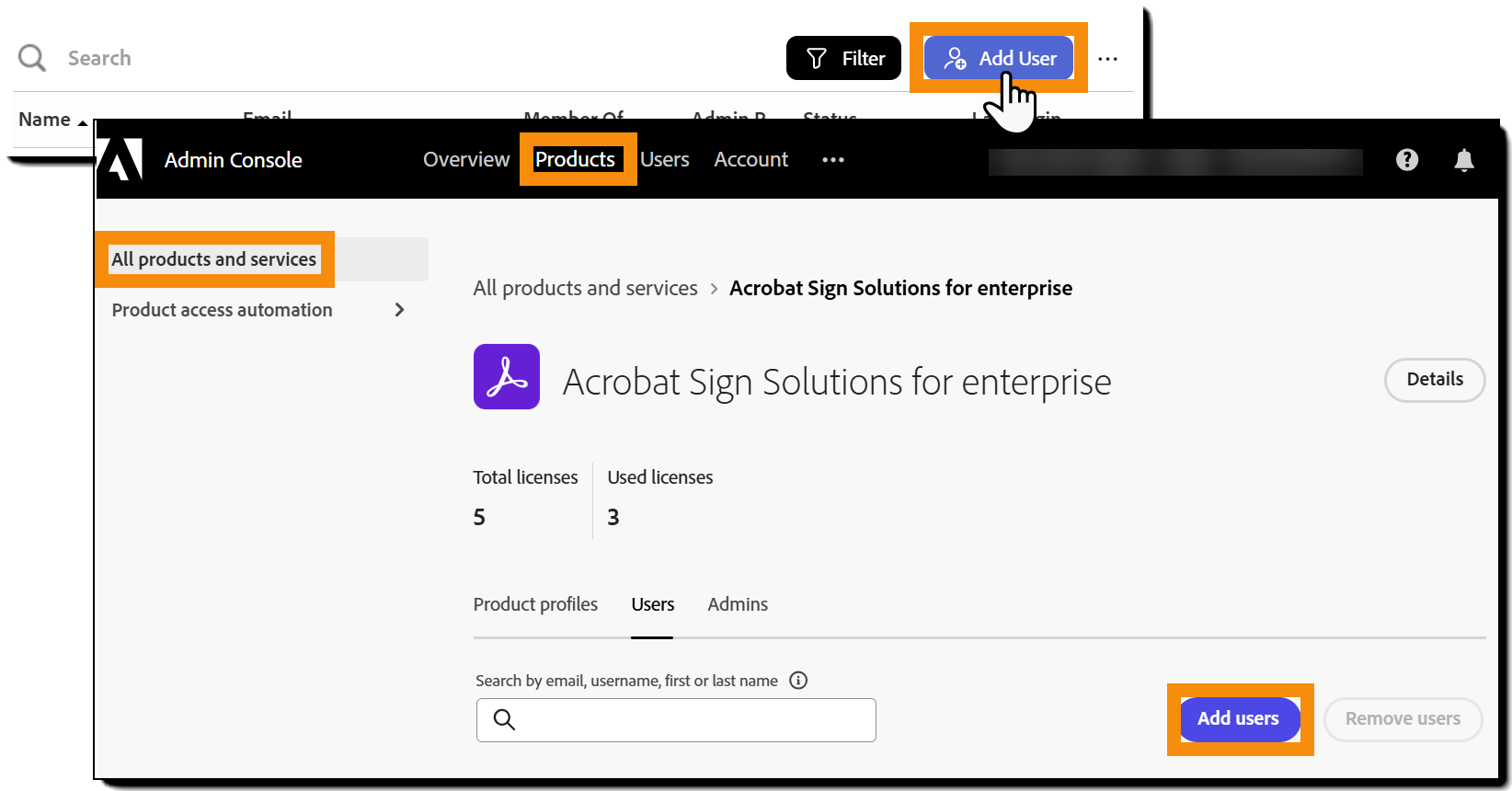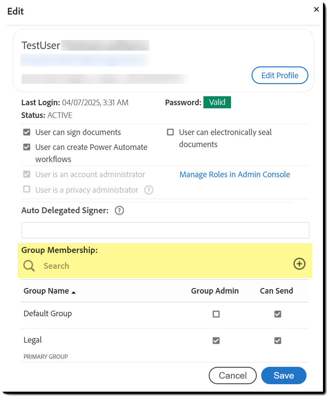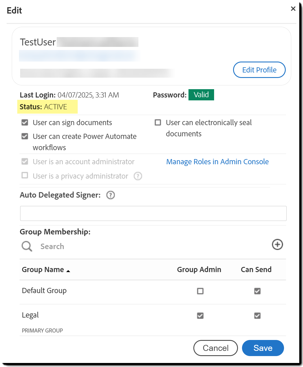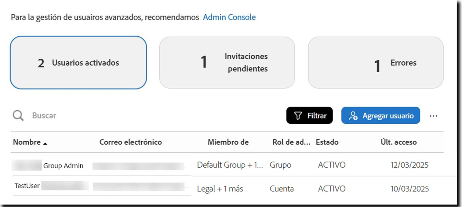 Puede actualizar los detalles de un usuario en Acrobat Sign, pero estos cambios solo se aplican al servicio Acrobat Sign. Las actualizaciones realizadas aquí no afectarán el acceso del usuario a otros productos o servicios de Adobe.