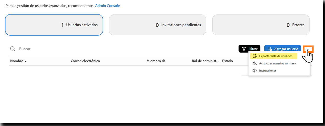 La vista Usuarios pendientes muestra a los usuarios que no han activado su ID de usuario utilizando el vínculo de correo electrónico o que aún no han iniciado sesión en el servicio. Desde la perspectiva de Adobe, la cuenta de usuario existe, pero el usuario no está utilizando el servicio.
