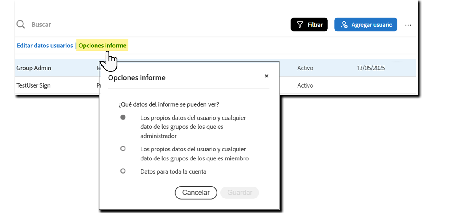 Solo puedes asignar permisos de administrador a nivel de grupo desde el perfil de usuario en la aplicación de Acrobat Sign.