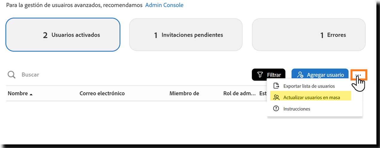- Solo los administradores de nivel de cuenta tienen autoridad para aprovechar las propiedades/el acceso entre grupos mediante la función Creación/Carga masiva de usuarios.
